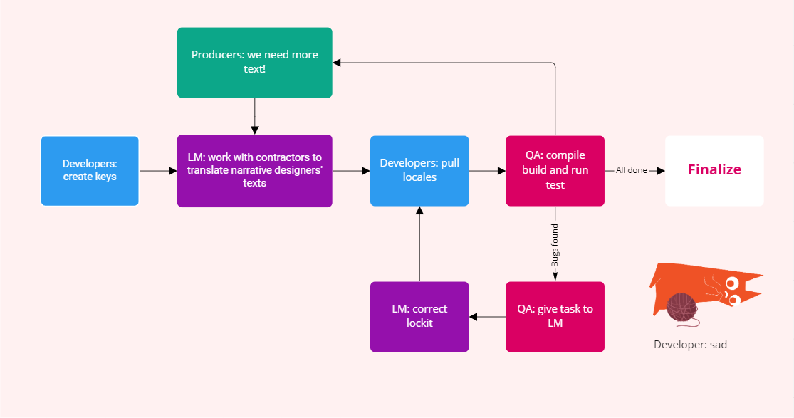 Their localization is handled by one team: ours. A vendor translates the game texts, and we add them to the lockits, which are then loaded into the games. We have sprints every two weeks, but our lockits are updated every day.
