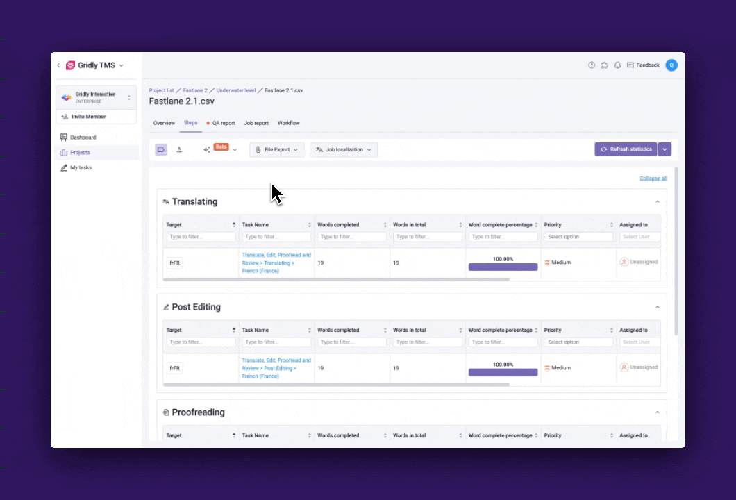 The Job Report gives you a clear view of translation work across all workflow steps. Compare MT output with human edits, review progress over time, and export reports to keep every update transparent and measurable.