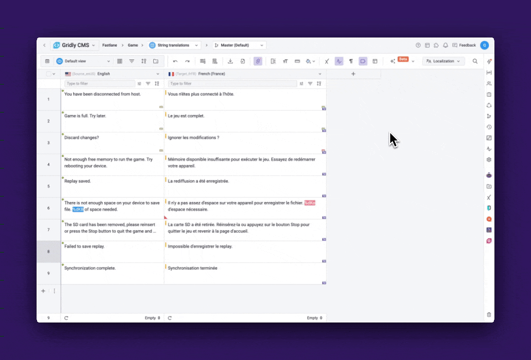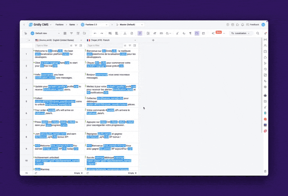 Custom tags let you define variables, formatting, code, or other text that shouldn’t be translated. Gridly then checks whether they appear correctly in both source and target languages.